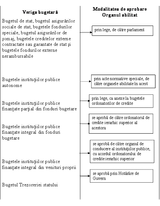 Modul de aprobare in detaliu al fiecarei categorii de buget precum si organele abilitate in acest sens, se pot prezenta astfel: