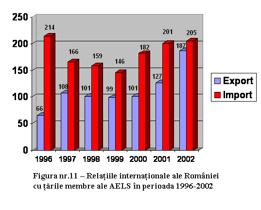 In continuare vom prezenta datele statistice privind volumul operatiunilor comerciale de import si export ale Romaniei cu tarile membre ale AELS in perioada 1996-2002 (a se vedea tabelul nr.8 si figura nr.11).
