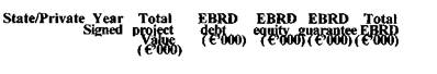 La 31 decembrie 1999, BERD semnase deja pentru 55 de proiecte in Romania, in valoare de 1.455,6 milioane euro sau 10,8% din totalul angajamentelor BERD. Portofoliul Romaniei este format din credite si investitii in urmatoarele sectoare: transporturi, telecomunicatii, servicii bancare, turism, societati comerciale private, societati de servicii detinute de municipalitati si distributia energiei electrice.