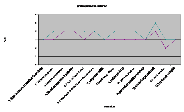 Observand modificarea raspunsurilor pe care santierul le da indicatorilor ce compun axa procese interne putem trage urmatoarele unele concluzii: santierul a avut o activitate constanta in ceea ce priveste productia deoarece el nu si-a modificat gradul de folosire a capacitatii de productie, in schimb si-a imbunatatit calitatea produselor lucru ce a fost posibil prin concentrarea asupra asigurarii calitatii.