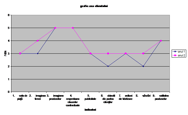 Analizand axa clienti observam ca santierul a obtinut note maxime pentru imaginea firmei si imaginea produselor ceea ce demonstreaza ca incercarile ei de promovare prin publicitate si reclame au dat roade. Nota maxima a obtinut si pentru respectarea clauzelor contractuale, lucru ce ne indica faptul ca santierul si-a pastrat imaginea de societate serioasa reusind sa respecte toate contractele si sa le onoreze la timp.