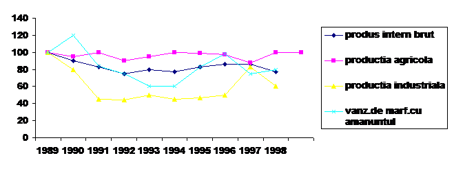 Se observa scaderi importante ale produsului intern brut ,productiei industriale si agricole in 1992 in comparative cu 1989.semnificative sunt si scaderile inregistrate de indicatorii mentionati in anii 1997 si 1998 ,datorate ,in principal ,unor actiuni mai energice de restructurare a economiei .aceste actiuni s-au soldat cu inchiderea sau reducerea drastica a activitatii unor agenti economici nerentabili ,generatori de pierderi si arierate in economie.