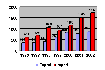 la 937 milioane USD in anul 1999; o scadere a volumului exporturilor s-a inregistrat in anul 2001 - 808 milioane USD comparativ cu 848 milioane USD in anul 2000 scaderea fiind de 40 milioane USD, in anul 2002 volumul exporturilor a crescut cu 74 milioane USD fata de anul 2001.