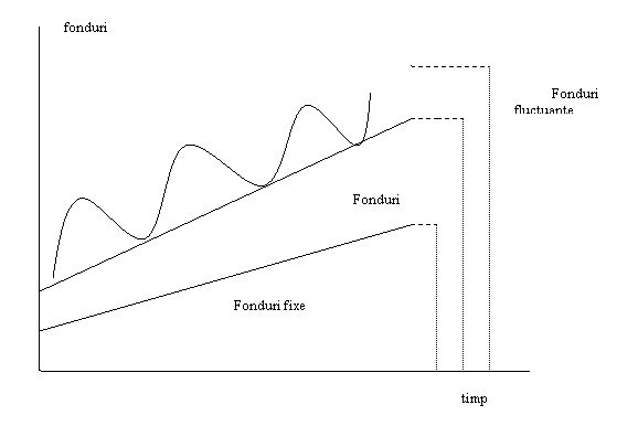 Desfasurarea ciclului de activitate al firmei necesita active fixe, finantate prin imprumuturi pe termen lung, active curente permanente, care variaza concomitent si in acelasi sens cu vanzarile, insa inregistreza si fluctuatii in productie si in vanzari, care reclama nevoi suplimentare, temporare de fonduri, ambele finantate prin imprumuturi pe termen scurt, aceasta distinctie fiind importanta pentru stabilirea nevoilor de fonduri ale clientului, si pentru planificarea portofoliului pe perioade mai lungi de 1 an. In figura nr. 8. sunt prezentate grafic nevoile permanente si fluctuante de fonduri ale firmei.