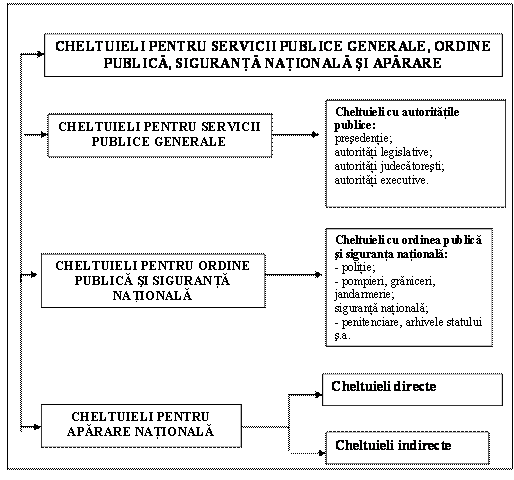 Aceasta categorie de cheltuieli priveste finantarea unor servicii publice generale, care se realizeaza prin institutii si organe ale puterii legislative, executive, judecatoresti si de ordine publica.