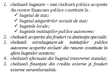 In cadrul cheltuielilor publice cea mai importanta categorie o reprezinta cheltuielile bugetare care se acopera din resursele prevazute in bugetul de stat, bugetul asigurarilor sociale de stat, bugetele locale si bugetele institutiilor publice autonome.
