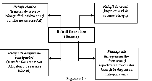 Relatiile clasice mai sunt cunoscute si sub numele de finante in sens restrans care impreuna cu celelalte trei categorii de relatii (de credit, de asigurari si reasigurari si finantele intreprinderii) alcatuiesc relatiile financiare in sens larg sau simplu, finantele. (Figura nr.1.4.)