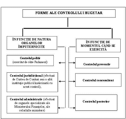 In Romania, controlul politic se executa de catre Parlament, controlul jurisdictional se realizeaza de catre Curtea de Conturi, iar controlul administrativ se efectueaza de catre Ministerul Finantelor Publice si celelalte ministere (agentii guvernamentale) si organe centrale.