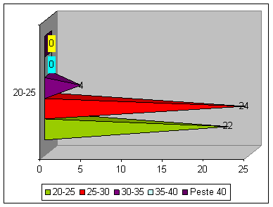 In urma analizei chestionarului 48 % din respondenti au varste cuprinse intre 25-30 ani, 44% au varste cuprinse intre 20-25, 8% intre 30-35. pentru intervalul de varsta 35-40 nu exista nici un subiect, le fel si pentru varsta de peste 40 ani.