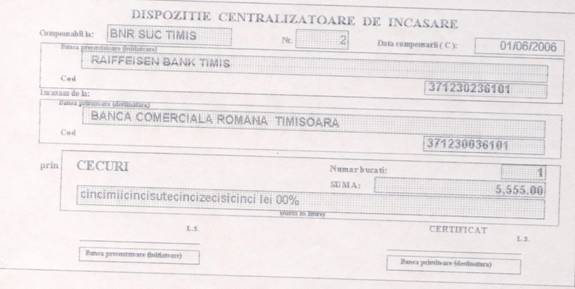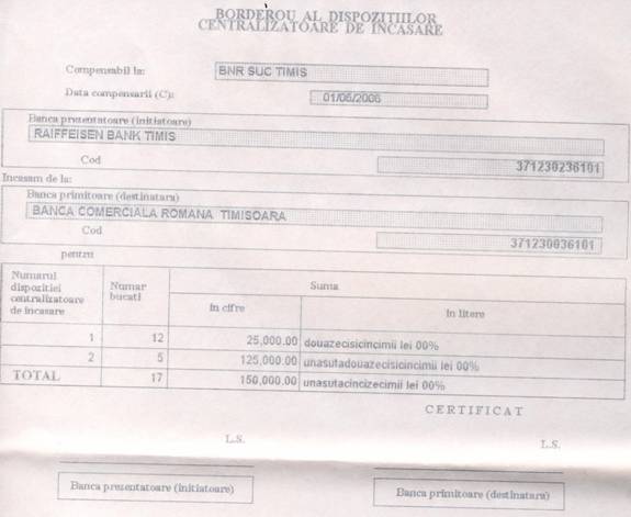 e) In situatia in care sumele preluate in borderoul dispozitiilor centralizatoare de incasare si totalurile acestora sunt corecte, agentul de compensare al unitatii bancare primitoare (destinatare) are obligatia sa certifice acest fapt, prin semnatura si stampila unitatii bancare pe care o reprezinta, agentului de compensare al unitatii bancare prezentatoare (initiatoare) pe exemplarul nr. 4 (vernil) al dispozitiei centralizatoare de incasare, in partea dreapta a rubricii "Certificat".