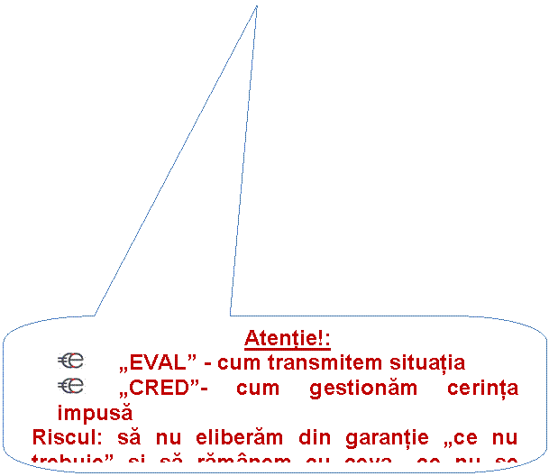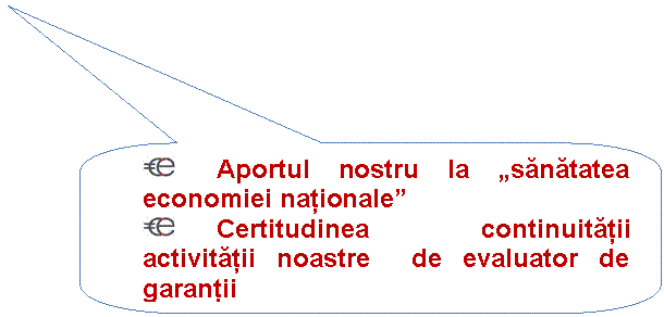 o Rolul "EVAL" este de a evidentia riscurile, a prezenta situatia spre BANK" pentru a intocmi actele, sau extinderile de garantie necesare eliminarii riscului (depistarea pe parcurs a unei astfel de situatii impune: instiintare confidentiala catre "BANK" si nu a debitorului care are tendinta de a fructifica avantajul dependetei in favoarea sa si in detrimentul bancii);