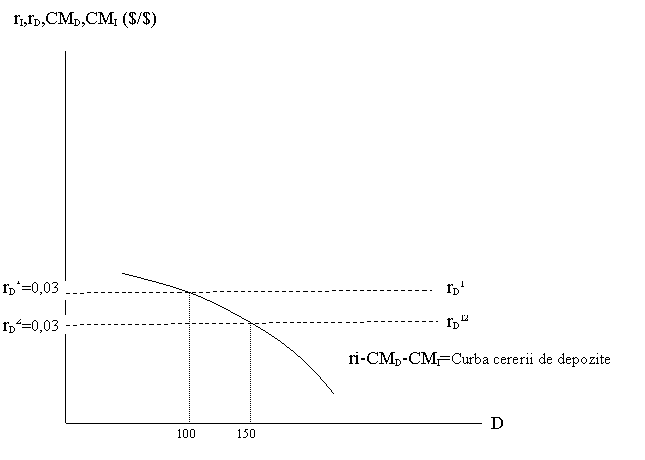 In plus, pentru a-si maximiza profitul economic o banca emite depozite pana la punctul la care rata dobanzii la depozite egaleaza venitul marginal net din imprumuturi, care reprezinta rata de piata a imprumuturilor minus costul marginal al resurselor reale aferente depozitelor si imprumuturilor. Deci, dupa cum se modifica rata dobanzii la depozite, banca variaza depozitele sale de-a lungul curbei venitului marginal net, ceea ce inseamna ca aceasta curba inclinata in jos reprezinta curba cererii de depozite, prezentata in figura nr. 3.
