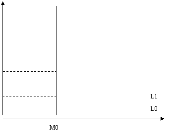 Linia descendenta (cu panta negativa), notata "L", reprezinta curba cererii pentru bani. Linia verticala, notata "M", reprezinta masa monetara. In acest model simplificat, masa monetara este determinata de sectorul bancar (in principal prin emisiunea monetara) si este considerata independenta fata de rata dobanzii. Rata dobanzii de echilibru este prezentata ca r , fiind determinata de intersectia curbei cererii pentru bani cu cea a ofertei de bani.