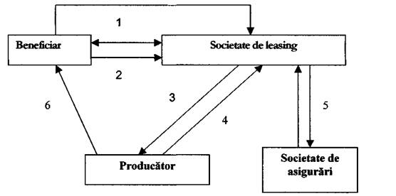 - leasing indirect, ce presupune existenta societatilor specializate de leasing, care preiau functia de creditare, pe cea de prestare de servicii, precum si asumarea riscurilor ce decurg din aceste operatiuni.