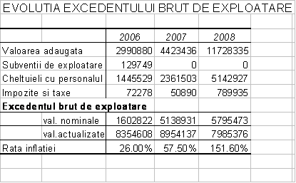 Excedentul brut de exploatare exprima acumularea bruta din activitatea de exploatare, stiind ca amortizarea si provizioanele sunt doar cheltuieli calculate, nu si platite. De aceea, pana la solicitarea lor (pentru investitii, riscuri sau cheltuieli), amortizarea si provizioanele calculate se regasesc in acumularile banesti ale intreprinderii. Excedentul brut de exploatare exprima capacitatea potentiala de autofinantare a investitiilor (din amortizari, provizioane si profit), de achitare a datoriilor catre bugetul statului si de remunerare a investitorilor de capital (actionarii si creditorii). Excedentul brut de exploatare al S.C. PANA PAN S.A. a inregistrat marimi relativ constante in termeni reali, societatea avand o buna capacitate de a-si remunera actionarii si de a restitui creditele bancare.