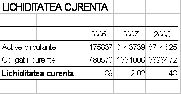 Indicatorul lichiditatii globale - "current ratio" in literatura anglo-saxona - reflecta posibilitatea tuturor componentelor patrimoniale curente ale intreprinderii de a se transforma intr-un termen scurt in lichiditati pentru a satisface obligatiile de plata exigibile. Unul din principiile fundamentale ale echilibrului financiar al intreprinderii este acela potrivit caruia activele curente trebuie sa aiba permanent o valoare mai mare decat obligatiile sau pasivele curente. Prin urmare, indicatorul lichiditatii globale trebuie sa aiba o marime supraunitara. In cazul S.C. PANA PAN S.A. se observa ca aceasta conditie va fi indeplinita in toti anii.