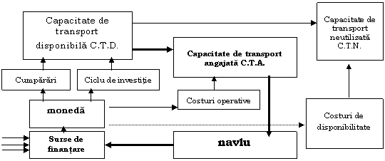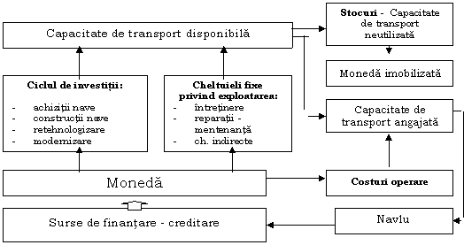 c) ciclul financiar - din acest ciclu fac parte operatiunile de creditare-finantare, achizitiile de titluri de plasament si operatiunile privind cesiunea creantelor. Caracteristic pentru operatiunile de creditare este ca in transportul maritim, in ciuda cheltuielilor uriase, se mizeaza pe venituri viitoare foarte mari, in devize, lucru care permite aprecierea pozitiva a lichiditatii si solvabilitatii pe termen scurt si confera (sau care ar trebui sa confere) intreprinderilor de transport accesul facil la creditele de trezorerie, pe termen scurt. Incertitudinile legate insa de riscurile la care activitatea de transport maritim este permanent supusa pe termen lung (asa cum am expus mai sus) diminueaza posibilitatile firmelor de finantare prin creditare pe termen lung; in aceasta privinta consideram insuficient de bine explorat aspectul garantarii imprumuturilor de acest gen. Ca solutie imediata pentru obtinerea de resurse financiare pe termen lung este de preferat apelul la actionarat si la emisiunea de titluri (actiuni, obligatiuni etc.).
