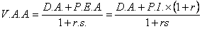 Evaluarea actiunii ordinare se prezinta in situatia detinerii o anumita perioada, pentru simplificare si explicitare sa consideram 1 an. Daca investitorul estimeaza ca pretul actiunii (P.I.) va creste in acest an cu rata r , in conditiile unui divdend estimat (D.A.), formula de evaluare pentru aceasta perioada, de determinare a valorii actualizate a actiunii (V.A.A.), considerand ca rata de actualizare este rata de rentabilitate ceruta a investitiei (r.s.), este: