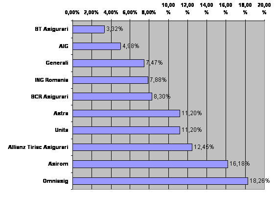 Societatile de asigurari apreciate nefavorabil cel mai frecvent de catre factorii de decizie din IMM-uri sunt: OMNIASIG (indicata in 18,26% din firme), ASIROM (16,18%), ALLIANZ-TIRIAC (12,45%), UNITA (11,20%), ASTRA (11,20%), BCR ASIGURARI (8,30%), ING ROMANIA (7,88%), GENERALI (7,47%), AIG (4,98%), si BT ASIGURARI (3,32%). Vezi figura 6.5.