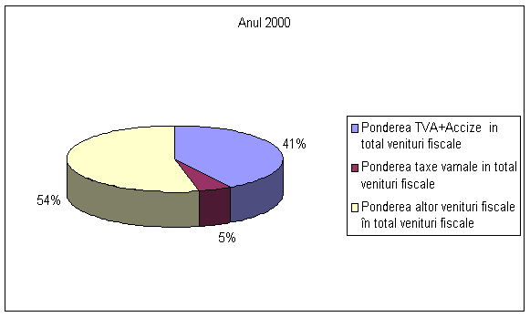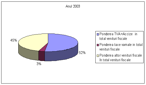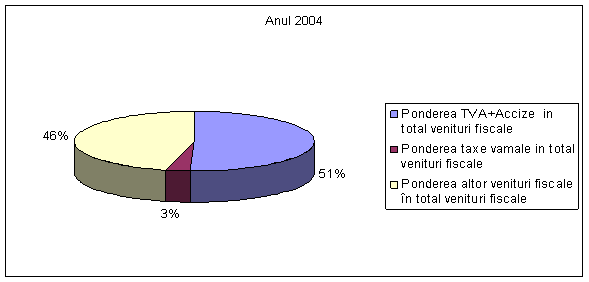 Aproximativ, in toti anii avuti in vedere, fiscalitatea indirecta este sustinuta de TVA si accize in medie de 50%-51%, urmate de taxele vamale a caror pondere din veniturile fiscale totale ale bugetului general consolidat este de 4%-5%. Ponderea mare, pe care o detin accizele si TVA in veniturile fiscale poate fi pusa pe seama cresterii consumurilor de bunuri si produse importate dar si pe faptul ca nivelul accizelor este majorat prin hotarare a Guvernului, in conformitate cu angajamentele asumate de Romania in procesul de negociere cu Uniunea Europeana