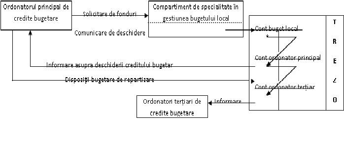 Potrivit cu verificarile asupra determinarii necesarului de credite bugetare ordonatorul principal intocmeste catre unitatea operativa a trezoreriei din localitate, o "comunicare de deschidere de credite" in care se precizeaza urmatoarele: luna pentru care se solicita deschiderea de credite bugetare, institutia de administratie publica pe seama careia se face deschiderea de credite, suma solicitata, capitolul de cheltuieli, contul in care urmeaza sa apara suma, structura cheltuielilor (curente, de personal si materiale, de capital).