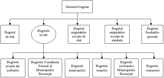 Sistemul bugetar din Romania are drept componente principale si definitorii urmatoarele: bugetul de stat, bugetul asigurarilor sociale de stat, bugetele locale, bugetul asigurarilor sociale de sanatate, bugetele fondurilor speciale (Fig. nr. 1). Comparativ cu aceasta structura este cea clasica intalnita in majoritatea lucrarilor de specialitate si anume, cea prezentata mai inainte, mai putin ultimele doua componente. La acestea se poate adauga, prin prisma cadrului juridic de actiune dat de legislatia finantelor publice , mai multe categorii de bugete care se refera, prin comparatie cu cele mentionate de noi (exceptand bugetul asigurarilor sociale de sanatate), si la alte individualizari bugetare ca: bugetele institutiilor publice finantate integral sau partial din bugetele locale; bugetele imprumuturilor interne si externe contractate sau garantate de autoritatile administratiei publice locale; bugetul trezoreriei statului; bugetele institutiilor publice autonome, etc.