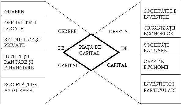 Tranzactiile dintre cele doua categorii de participanti amintiti mai sus se efectueaza intr-un cardu organizat prin intermediul pietelor financiare. Acestea se impart dupa tipul de active tranzactionate si modalitatea prin care acestea sunt introduse in circuitul economic in trei mari ramuri: piata bancara, piata monetara si piata de capital. Daca primele doua se ocupa cu tranctionarea de active bancare nonnegociabile si active financiare pe termen scurt, piata de capital este specializata pe tranzactii cu active financiare pe termen mediu si lung, prin intermediul lor asigurandu-se transferurile de capitaluri disponibile catre utilizatorii ale caror nevoi depasesc posibilitatile interne de finantare.