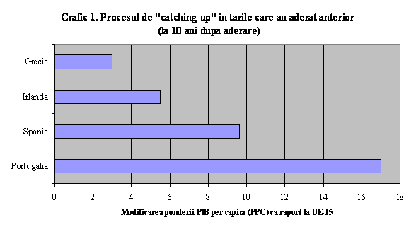 Una din lectiile desprinse din procesele de aderare anterioare este ca procesul de "catching-up" necesita mult timp si continua mult timp dupa aderare. Procesul de tranzitie nu previne riscul unor evolutii frante, de genul "stop-and-go". Convergenta reala se obtine prin politici macroeconomice sustinute. Procesul de tranzitie al celor 10 noi state membre ale Uniunii Europene a fost prea scurt pentru a putea evalua viteza procesului de "catching-up", luand in considerare si toate evolutiile influentate in mod semnificativ de evolutiile macroeconomice pe termen scurt. Tarile care au aderat mai demult (Grecia, Irlanda, Spania, Portugalia) nu sunt direct comparabile, deoarece conditiile de plecare si structura economiei erau diferite de cele din estul si centrul Europei. Totusi, in aceste patru tari, nivelul veniturilor la momentul aderarii era cu mult sub media veniturilor in UE, iar procesul de "catching-up" s-a dovedit a fi semnificativ in timp (Grafic 1). In cazul acestor tari, procesul de convergenta a durat multi ani, astfel incat, Portugalia, cea mai performanta tara din grup, a reausit sa creasca PIB pe locuitor cu 17 procente comparativ cu media UE in abia 10 ani de la aderare. In cazul Greciei, veniturile raportate la media UE au scazut in prima faza, sugerand faptul ca performanta macroeconomica in ansamblu este un factor determinant pentru cresterea reala a veniturilor. In Irlanda, cresterea accelerata a veniturilor a aparut mai tarziu, multi ani dupa aderare. Experienta acestor tari sugereaza ca Romania, care are un nivel al veniturilor reale mult mai redus, va avea de parcurs mai degraba un "maraton" decat un "sprint" scurt in procesul de convergenta catre standardele de viata UE. Reducerea decalajelor intre venituri reprezinta, de buna-seama, cel mai important obiectiv al autoritatilor dar si un element pentru cresterea participarii populatiei la procesele de reforma, adeseori dure. Totusi, cresterea sperantelor cu privire la salturi rapide ale veniturilor pe cap de locuitor poate fi daunatoare in sine, prin faptul ca incurajeaza populatia sa cheltuiasca peste posibilitati, conducand astfel la cresterea in continuare a gradului de indatorare a consumatorilor si la expansiunea nesustenabila a consumului. Justificarea cresterilor extraordinare a salariilor in sectorul public in 2004-2005 prin prisma procesului de "catching-up" trebuie privita cu prudenta. Asteptarile nerealiste cu privire la cresterea rapida a veniturilor ca urmare a aderarii va alimenta presiunea din partea cererii si va creste riscul unor evolutii de tipul "stop-and-go".
