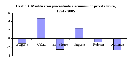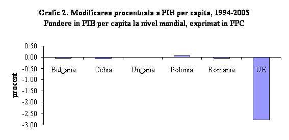 Experienta noilor state membre este mixta, si oarecum mai slaba decat a multor alte economii emergente. Aderarea poate influenta evolutia tarii intr-o oarecare masura dar performanta depinde de taria reformelor si de politicile macroeconomice in general. Aderarea la UE este importanta in promovarea reformelor dar nu trebuie privita ca pe un panaceu. In ultima decada, noile state membre au facut progrese considerabile in dezvoltarea unor economii de piata competitive si stabilizarea macroeconomica. Cu toate acestea, in ciuda dificultatii masurilor structurale, procesul de "catching-up" al standardelor de viata a fost lent, cu diferente semnificative de la o tara la alta. Economia romaneasca, ca structura, este comparabila cu noile tari membre mai mari, cum ar fi Polonia, Cehia si Ungaria. Este interesant faptul ca, desi aceste noi state membre au facut progrese insemnate raporte la zona Euro, puterea de cumparare in raport cu PIB-ul la nivel mondial a fost static sau chiar in descrestere (Grafic 2). Explicatia consta intr-o mai slaba performanta a zonei euro si o crestere mult mai rapida a altor economii emergente. Procesul de tranzitie in cazul tarilor aflate in cursa pentru aderare a fost raportat in mod natural, la zona Euro. Totusi, Romania isi poate compara performantele si cu alte economii emergente mai dinamice, atat timp cat, in ultima instanta, cresterea reala a veniturilor va depinde de succesul in crearea unei piete competitive si in implemetarea reformelor structurale. Multe domenii importante, cum ar fi reforma pietei fortei de munca si politicile macroeconomice nu sunt subiecte ale aquis-ului EU, insa Romania trebuie sa fie constienta ca va fi membra a unui bloc economic a carui evolutie a fost incetinita tocmai de progrese lente in domeniul principalelor reforme structurale. In timp ce procesul de aderare a constituit un impuls puternic pentru Romania, in viitor, ritmul procesului de convergenta va depinde de vigoarea cu care reformele structurale vor fi implementate si de performanta sa macroeconomica dupa aderare. Intr-adevar, procesul de revigorare a veniturilor reale a demarat abia la inceputul anilor 2000, pe fondul implementarii unor politici macroeconomice mai stabile.