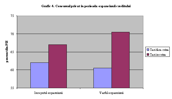 Experienta noilor state membre a fost mixta in timp si este greu de tras o concluzie, deoarece explozia consumului a condus in unele tari la reducerea gradului de economisire, iar in alte tari la cresterea economisirii (Grafic 3). In Ungaria, cresterea economica puternica de la mijlocul anilor '90 a fost insotita de cresterea economiilor populatiei si de consolidarea contului curent. Ulterior, in perioada 2001-2005, gradul de economisire s-a deteriorat, facand ca cererea sa devina mai greu de administrat. De asemenea, Polonia s-a confruntat cu imbunatatirea gradului de economisire in perioada de crestere de la mijlocul anilor '90, dar cu o si mai accentuata deteriorare a contului curent in perioada 1997-1999, pe fondul cresterii investitiilor. In anul 2000 se observa o scadere a economisirii si a investitiilor, dupa care se inregistreaza o imbunatatire. In Cehia, diminuarea gradului de economisire are loc la mijlocul anilor '90, in perioada boom-ului, urmata de revigorare si, recent, in 2003-2004, de derapaje. In comparatie cu celelalte tari, putem spune ca in Romania cele 4 procente de reducere a nivelului economiilor reprezinta un declin accentuat. Explozia consumului are loc intr-o perioada de inceput a revigorarii economice, inainte ca impactul cresterii investitiilor sa se fi manifestat. Hilbers si ceilalti (2005) au comparat atat tarile aflate in criza cat si cele care nu se afla in criza dar care se confrunta cu expansiunea consumului finantat de cresterea rapida a creditului (Grafic 4). Analiza arata ca tarile care nu au reusit sa modereze cresterea consumului inainte ca nivelul creditului sa atinga un maxim au fost mult mai probabil in situatia de a infrunta o criza, sugerand astfel necesitatea unui rol pro-activ mai pronuntat in conducerea politicilor care vizeaza cererea.