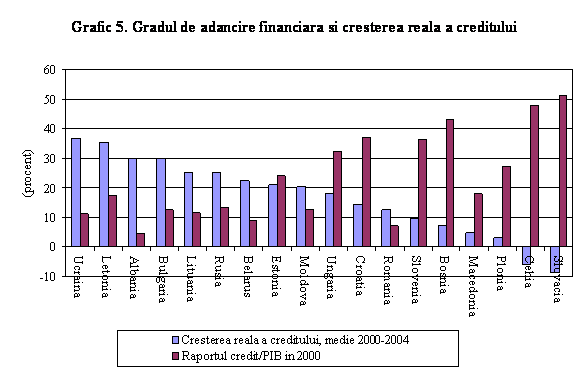 Realitatea suprinsa in noile state membre arata ca expansiunea creditului este legata de nivelul de intermediere financiara, dar studii recente au formulat intrebarea "cat de repede este prea repede?" Experienta altor tari arata ca perceptia asupra stabilitatii politicilor economice joaca un rol important in incheierea blanda sau abrupta a expansiunii, indiferent de gradul de intermediere financiara. Cresterea puternica a creditului in Europa centrala si de est a fost partial finantata de cresterea rapida a creditului bancar catre sectorul privat. In ultimii ani, ratele de crestere a creditului catre sectorul privat (atat companii cat si populatie) s-au situat frecvent in intervalul 30-50 procente pe an. Sporirea increderii populatiei a venit intr-un moment in care privatizarea bancilor, competitia dintre banci pentru castigarea pietei inainte de aderare, precum si scaderea oportunitatilor de plasamente atractive in alte zone au determinat cresterea apetitului bancilor de a imprumuta in aceasta zona. Gradele de intermediere financiara in tarile central si est Europene erau considerabil diferite in faza initiala, astfel incat, in anul 2000 Slovacia inregistra un nivel al creditului catre sectorul privat de 50 procente din PIB, in timp ce Albania avea sub 5 procente. Graficul 5 arata ca cele mai rapide rate de crestere a creditului real incepand cu anul 2000 sunt asociate cu cele mai modeste niveluri ale intermedierii financiare, venind astfel in spijinul ipotezei ce acrediteaza procesul de "catching-up". Nivelul intermedierii financiare a fost strans asociat cu nivelul investitiilor directe. Tarile cu cel mai inalt nivel de intermediere financiara, precum Cehia si Slovacia au avut si cele mai ridicate niveluri ale investitiilor. De aceea, de multe ori s-a considerat ca expansiunea creditului reprezinta o parte fireasca a convergentei reale, promovand cresterea economica, diminuarea expansiunii facandu-se de la sine, pe masura ce se atinge "nivelul de echilibru al raportului dintre credit si PIB"[2] . In mod evident, succesul procesului de convergenta reala depinde nu numai de marimea si eficienta intermedierii financiare ci si de potentialul macroeconomic si de riscurile prudentiale. La sfarsitul anilor '90, in Romania si in Bulgaria s-a manifestat un declin al creditului catre sectorul privat, care a reflectat restructurarea sectorului bancar, cu scaderea creditului catre sectorul privat la 15 procente din PIB in Bulgaria si la 7 procente in Romania. In ultimii 2-3 ani, expansiunea creditului in ambele tari a ridicat intrebarea "cat de repede este prea repede?".