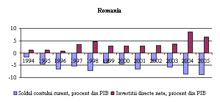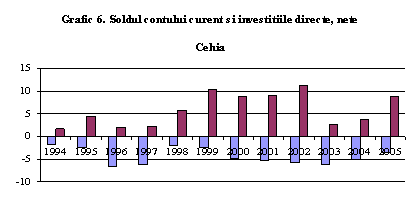 Toate NSM s-au confruntat cu deficite de cont curent. Totusi, existenta unor politici financiare disciplinate este critica pentru a preveni ramanerea economiilor mult in urma investitiilor. Este posibil ca in timp, pe masura ce pietele de capital se dezvolta, finantarea deficitelor sa devina mult mai volatila. Toate tarile noi membre au afisat deficite de cont curent considerabile, ceea ce a condus la ideea ca adancirea deficitelor este o situatie fireasca a procesului de tranzitie. Se considera ca pentru a atinge convergenta printr-o rata inalta a investitiilor, in conditiile in care economiile interne private sunt scazute, iar sistemele financiare slabe (Schadler si ceilalti (2006)) este necesara atragerea economiilor din strainatate. Finantarea deficitelor de cont curent in noile state membre s-a facut in mare parte prin ISD, investitiile de portofoliu fiind limitate de pietele de capital ilichide si ineficiente. Aceasta abordare "blanda" cu privire la cresterea deficitelor de cont curent se bazeaza pe o viziune economica implicita care sugereaza ca finantarea unor asemenea deficite este sustenabila pe termen lung, data fiind cresterea economica anticipata puternica. O asemenea viziune se bazeaza in principal pe ipoteza ca, existenta unei politici financiare disciplinate nu va permite in timp ratei interne de economisire sa se abata de la rata investitiilor. Mai mult, ipoteza conform careia ISD vor continua sa finanteze deficitele intr-o maniera care nu creaza datorii devine chestionabila, in timp. Procesul de privatizare a incetinit in multe noi state membre, iar dezvoltarea pietelor financiare va stimula emergenta unor surse mai volatile de finantare, cum ar fi investitiile de portofoliu. Graficul 6 compara evolutia deficitelor de cont curent si a fluxurilor de investitii direct din Romania cu cele din Ungaria, Poloniasi Cehia. Experienta Romaniei in ceea ce priveste convergenta deficitului de cont curent cu investitiile directe este similara cu cea din Polonia si Cehia la inceputul anilor 2000. Ambele tari au suferit o puternica deterioarare a investitiilor directe inainte de aderare, deoarece investitorii se stabilisera deja pe aceste piete. Este de mentionat faptul ca scaderea investitiilor directe in Ungaria si Cehia nu a fost asociata cu imbunatatirea contului curent. Dimpotriva, se constata o trecere catre influxurile de capital cu volatilitate mai mare, ceea ce sugereaza ca adancirea dezechilibrelor poate conduce la presiuni asupra politicilor de management al cererii, indiferent de sursa initiala de finantare.