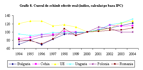 Dintre predecesorii Romaniei, Cehia si Polonia s-au confruntat cu apreciere reala puternica, ce s-a temperat la inceputul anilor 2000, iar in Ungaria aprecierea a continuat si in 2004 (Grafic 8). Unele studii arata ca aprecierea reala puternica din aceste tari in anii '90 nu poate fi in totalitate explicata prin cresterea productivitatii in sectorul de bunuri tranzactionabile (tradables, efectul Balassa-Samuelson). Principala cauza a aprecierii reale o reprezinta investitiile straine directe, deoarece pot genera castiguri nete la export, conducand astfel la o apreciere reala. Bulir si Smidkova (2005) arata ca indicatorii economici de baza justifica aproape 60 de procente din aprecierea reala in Cehia, Polonia si Ungaria. Ei atribuie restul de 40 de procente asteptarilor prea optimiste cu privire la viteza de convergenta reala, impactului temporar al intrarilor de capital din privatizare si efectul psihologic al procesului de extindere a EU.