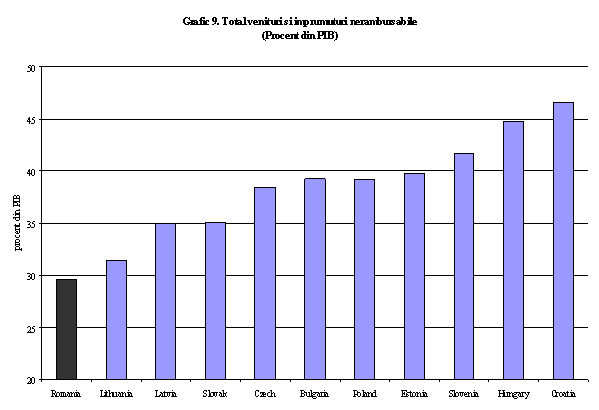 In noile state membre se constata existenta unei relatii slabe intre deficitul bugetar si nivelul investitiilor. Politicile fiscale relaxate in noile state membre, in comparatie cu alte piete emergente, pot arata o anume viziune privind alegerea intre convergenta reala si nominala. In cazul Romaniei, principala problema cu care se confrunta o reprezinta nivelul scazut al veniturilor bugetare. Conturile fiscale s-au deteriorat semnificativ in perioada ce a precedat aderarea la UE. Conditiile macroeconomice nu au fost corelate cu procesul de aderare, pe fondul unei alegeri teoretice implicite intre convergenta reala si nominala. Concret, a existat o viziune comuna conform careia deficitele trebuie tolerate deoarece ele sunt instrumente pentru finantarea investitiilor si asigurarea cresterii economice in timpul tranzitiei. De aceea, a fost o coincidenta intre presiunile populiste din aceste tari pentru deficite mai mari si institutiile UE, care au favorizat un proces lent de acces in zona Euro (Coricelli, 2005). Romania se confrunta cu o provocare suplimetara deoarece intra in cursa pentru convergenta reala, in conditiile unei baze scazute a veniturilor, in comparatie cu noile state membre (Grafic 9). Presiunile pentru mentinerea diminuarilor recente de impozite, combinate cu cererea pentru cheltuieli derivate din procesul de aderare la EU au facut si mai dificila folosirea politicii fiscale ca instrument de management macroeconomic.