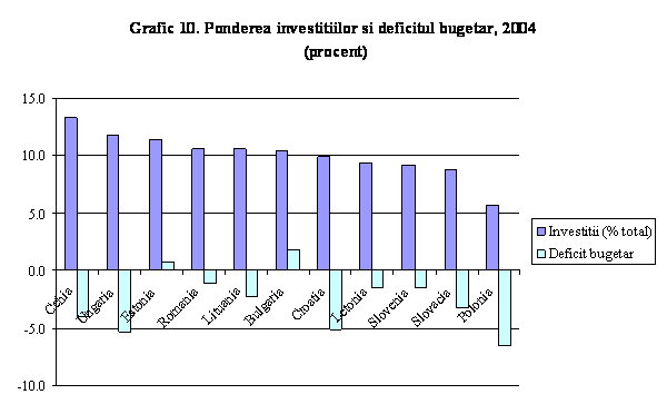 O comparatie intre tarile in tranzitie care au inregistrat deficite mici, cum ar fi tarile baltice si Slovenia si alte tari in tranzitie, dar care au inregistrat deficite mai mari, cum ar fi Ungaria si Cehia, sugereaza ca deficitele mari nu pot fi atribuite procesului de convergenta catre UE, din moment ce toate aceste tari au fost subiectul aceluiasi proces de tranzitie. Nu exista o corelatie clara intre nivelul deficitului bugetar si investitiile publice, contrar justificarilor folosite adeseori de acele noi state membre care prezinta deficite bugetare mari (Grafic 10). Faptul ca aceste marimea acestor tari variaza, sugereaza ca atat factorii de natura politicilor economice cat si constrangerile mai puternice cu care se confrunta economiile mici si deschise conteaza. O posibila explicatie este acceea ca nivelul scazut al raportului dintre datorie si PIB in noile state membre in comparatie cu UE - 15 a fost considerat o justificare pentru deficite mai mari. Totusi, datoria noilor state membre trebuie considerata ca si datoria tarilor emergente, si ca atare, supuse acelorasi volatilitati si riscuri. De exemplu, indicatorii datoriei in America Latina sunt de acceasi magnitudine. Noile state membre au inca piete financiare subdezvoltate, iar raportul dintre datorie si M2 este apropiat celor din UE - 15, iar in cazul Ungariei si Poloniei chiar mai mari. Se constata ca noile state membre, in perioada procesului de tranzitie, se confrunta cu o volatilitate mai ridicata a veniturilor ca raport din PIB, in timp ce cheltuielile sunt rigide, ceea ce sugereaza o mai mare vulnerabilatate la socuri in general. In Romania, indicatorii datoriei se mentin la un nivel scazut, dar evolutia viitoare depinde de directia politicilor economice ce vor fi adoptate.
