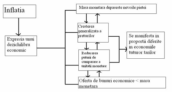 In acest sens , punctual de pornire il reprezinta dezechilibrul pe care - l marcheaza inflatia - intre masa monetara excedentara in comparatie cu volumul bunurilor si serviciilor.Indiferent de cauzele care genereaza acest dezechilibru , excedentul de masa monetara de care dispun agentii economici reprezinta de fapt o cerere de bunuri si servicii nesatisfacuta.Daca din diferite motive ( insuficienta factorilor de productie , imposibilitatea de a mari eficienta lor , progresul tehnico - stiintific lent , etc.) volumul bunurilor si serviciilor ramane in urma masei monetare, aceasta situatie determina o crestere a preturilor si scaderea proportionala a puterii de cumparare a banilor , concretizand astfel prezenta inflatiei.