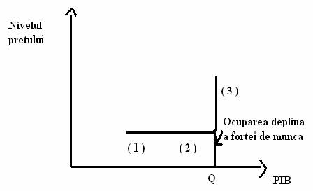 Daca economia produce la intreaga ei capacitate , productia nu mai poate creste.Orice crestere a cheltuielilor totale , in aceste conditii , este de natura inflationista.In faza initiala ( 1 ) , cheltuielile totale ( pentru consumul privat sau public , investitii sau export net ) sunt mici , iar economia nu produce la capacitate maxima.Aceasta inseamna ca PIB este mic , rata somajului este ridicata , iar intreprinderile au capacitati de productie nefolosite.Cresterea cererii , in aceste conditii , va determina intreprinderile sa - si mareasca productia.Ele vor angaja lucratori , iar numarul somerilor se va reduce.Pe ansamblul economiei , se va constata cresterea PIB si reducerea ratei somajului , fara ca preturile sa creasca semnificativ.