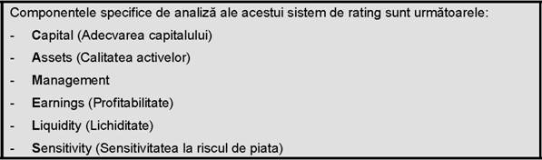 Sistemele de rating bancar utilizeaza informatii relevante despre caracteristicile unei institutii de credit si contrapartidele acesteia pe baza carora este furnizata o masura sintetica a performantelor si/sau vulnerabilitatilor lor. Sistemul de rating bancar si de avertizare timpurie - CAMELS (dezvoltat in anii `80 de FED-ul american) este un astfel de instrument.