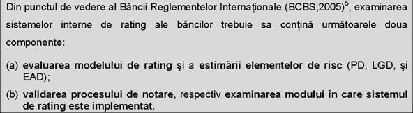 Modul in care aceste deficiente pot fi corectate prin procesul de validare si monitorizare continua a modelelor interne si rolul autoritatii de supraveghere in acest sens sunt subiectul a numeroase discutii atat in mediul academic cat si in practica de specialitate. Termenul de validare denota intregul proces de evaluare, incepand cu analiza modelului conceptual si terminand cu testarea acuratetei calibrarii. Finalitatea acestui proces consta in verificarea consistentei rezultatului generat de sistemul de rating din perspectiva rolului sau la nivelul managementului riscului de credit si in scopuri de supraveghere. De asemenea, se urmareste si evaluarea modului concret in care acest rezultat este folosit in activitatea de administrare a riscului de credit, precum si daca modalitatea de utilizare este conforma cu precizarile testului de aplicare ("use test") asa cum sunt ele definite in BASEL II.