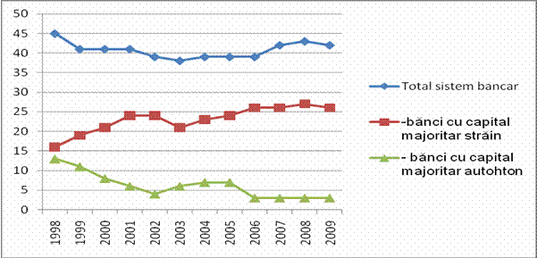 Pe acest fond de concentrare (manifestat prin reducerea numarului de banci), dar si de concurenta datorita numarului inca relativ mare de banci se observa o crestere a numarului de banci cu capital strain. Astfel numarul de banci cu capital strain a crescut constant dupa 1998, de la 16 in 1998, la 26 in anul 2009 (fig. 1.1).
