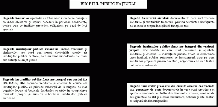 Din punctul de vedere juridic sistemul bugetelor publice reprezinta acte de autorizare care aproba prin lege venituile si cheltuielile publice pe parcursul exercitiului financiar-fiscal. Bugetul public national (alcatuit din bugetul de stat, bugetul asigurarilor sociale de stat si bugetele locale teritoriale) poate fi caracterizat si ca un plan financiar macroeconomic, instrument de politica a statului in domeniul economic si social, document programatic al infaptuirii obiectivelor strategice al factorilor de decizie politica.