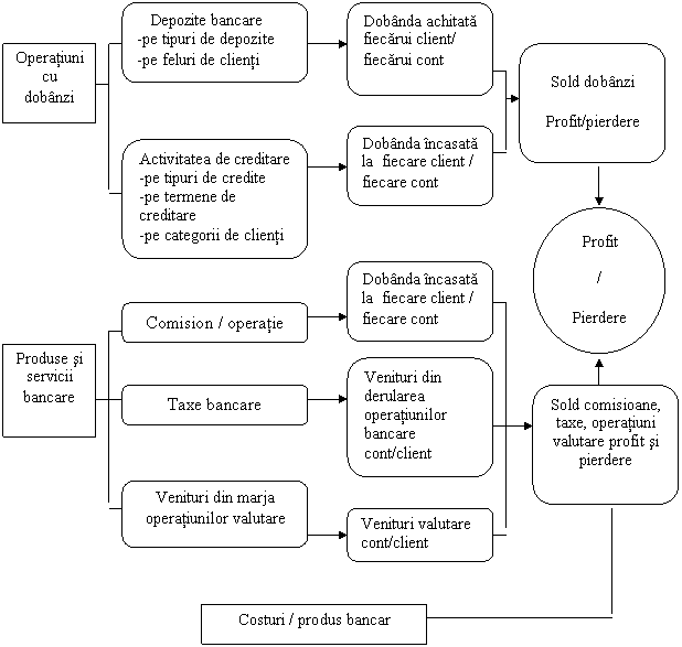 Prin extrapolarea terminologiei din contabilitatea de gestiune in activitatea bancara, are loc defalcarea cheltuielilor pe purtatori de costuri si locuri de cheltuieli denumite centre de cost, ce reprezinta unitati de afaceri ce nu realizeaza venituri, dar sunt in schimb consumatoare de active; de asemenea activitatile bancare sunt organizate ca centre de profit, ce reprezinta entitati de afaceri de sine statatoare, prin intermediul carora se realizeaza venituri.