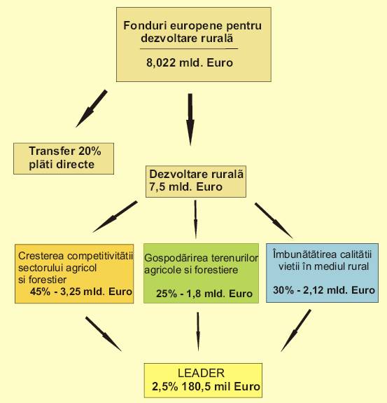 Prin Figura 3.1, am considerat ca ar fi util sa arat distributia sumelor alocate din fondurile europene pentru dezvoltarea rurala, astfel incat, din totalul fondurilor FEADR de 8,022 miliarde de Euro pentru perioada 2007-2013, se vor utiliza 20% pentru platile directe, iar restul de 7,5 miliarde de Euro vor fi alocati dezvoltarii rurale, 45% pentru Axa I, 25% pentru Axa II, 30% pentru Axa 3 si 2,5% pentru Axa IV[13].