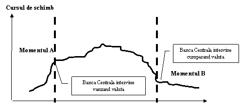 Dupa cum se poate observa din schema de mai sus, rolul interventiei Bancii Centrale este de a tempera evolutia cursului de schimb si de a evita intrarea economiei intr-o criza de durata. Banca Centrala nu se opune evolutiei ratei de schimb ci reduce din amplitudinea evolutiei acestuia, incercandu-se o distribuire uniforma in timp a deprecierii monedei nationale. O astfel de politica poate fi aplicata cu succes si atunci cand apar presiuni speculative pe curs.