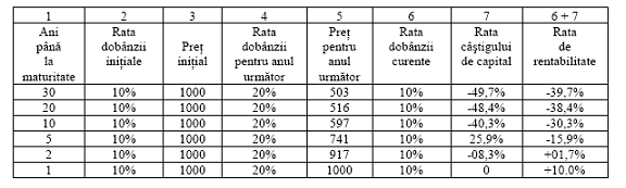 Se poate observa ca o obligatiune cu o maturitate de 30 ani, inregistreaza o pierdere de capital de 49,7% daca rata dobanzii creste de la 10% la 20%. Daca maturitatea devine mai apropiata, raspunsul pretului obligatiunii este de mai mica amploare. Se explica astfel, comportamentul obligatiunilor pe piata in functie de maturitate: preturile si rentabilitatea obligatiunilor pe termen lung sunt mai volatile (prezinta o mai mare variabilitate), comparativ cu titlurile pe termen scurt. Din acest motiv, obligatiunile cu maturitate indepartata nu sunt considerate sigure din punct de vedere al rentabilitatii produse.