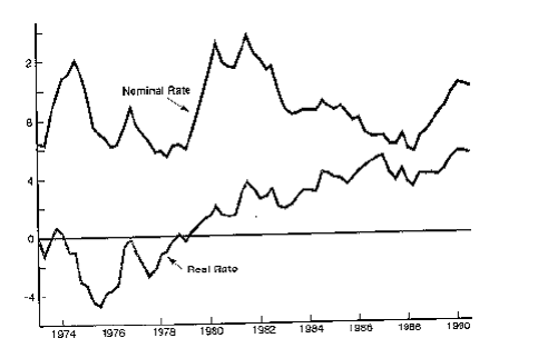 Graficul urmator prezinta evolutia ratelor medii ale dobanzii nominale si reale, pentru 9 tari puternic industrializate (cu exceptia SUA), In perioada 1973 - 1990. Esential in aceasta figura, este modul diferit de modificare a ratei dobanzii, exprimata in termeni reali si nominali.