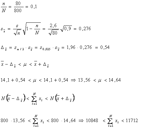 Exemplu: Sa se determine intervalul de incredere, garantat cu o probabilitate de 95% pentru media si nivelul total al unei caracteristici numerice X, daca esantionul selectat aleator repetat este de 36 de unitati (adica, 5% din colectivitatea generala), de medie 800 si abatere medie patratica 60.