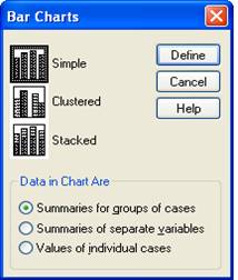 Diagrama cu bare este folosita pentru a reprezenta grafic mediile diferitelor grupe dintr-o colectivitate (Summaries for groups of cases) sau valorile medii ale diferitelor variabile pentru aceeasi colectivitate (Summaries of separate variables).