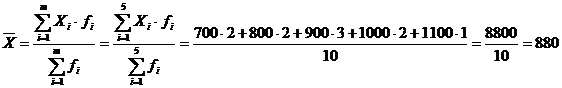 B. pentru seriile cu distributie de frecvente, adica in cazul in care variantele caracteristicii se inregistreaza de mai multe ori (in exemplul anterior acelasi salariu este inregistrat la mai multi salariati: 900 u.m. la 3 salariati, 1000 u. m., 800 u.m. si 700 u.m. la cate 2 salariati, 1100 u.m. la 1 salariat.