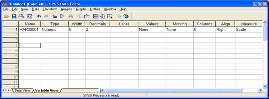 Aceasta este fereastra Data Editor a SPSS-ului si este un spatiu de lucru cu linii si coloane in care pot fi introduse datele.